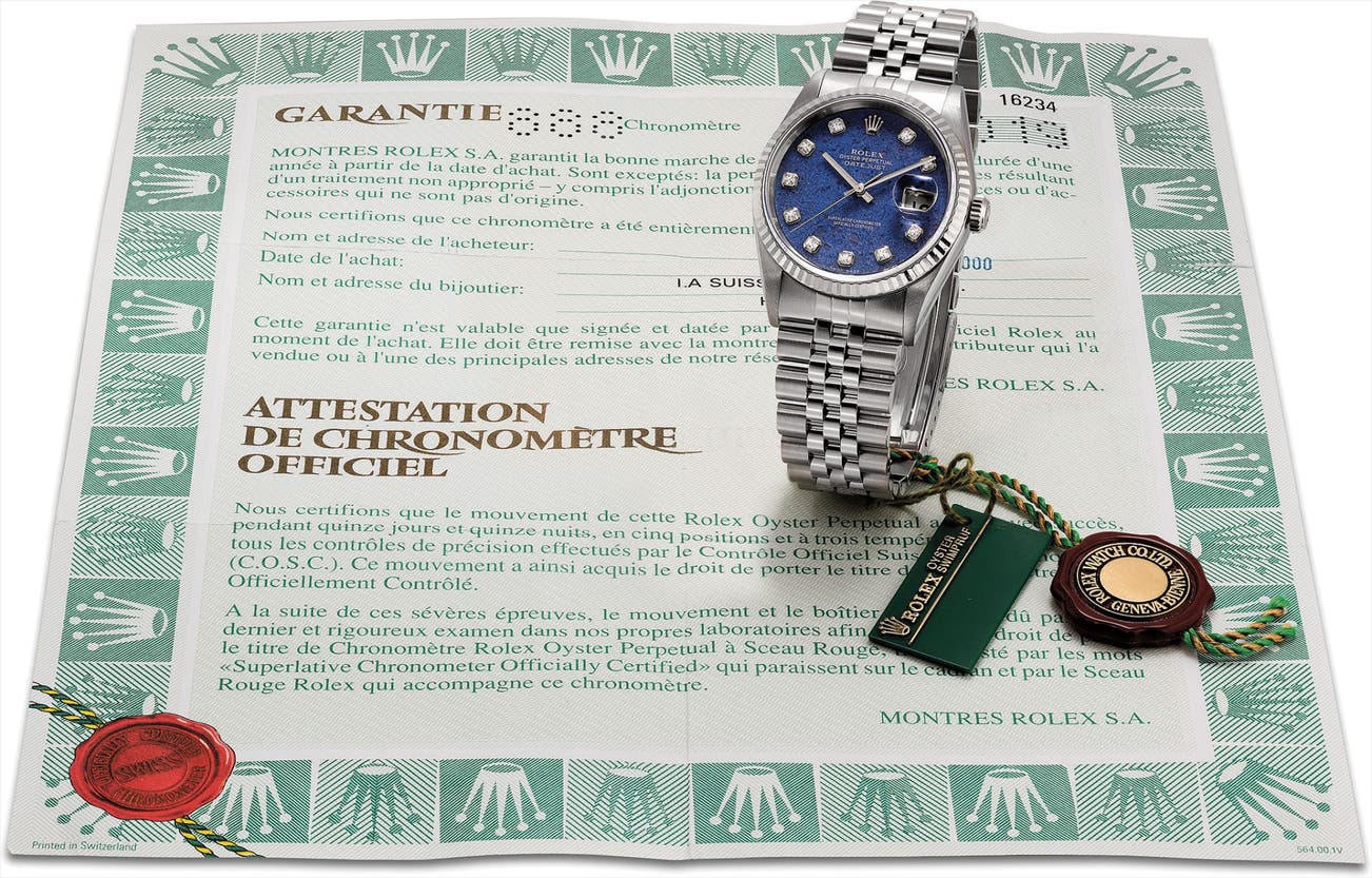 The present example is enhanced with such a dial and further complemented by 10 diamond-set numerals. The watch is offered in excellent overall condition and still with all original sale tags and guarantee.