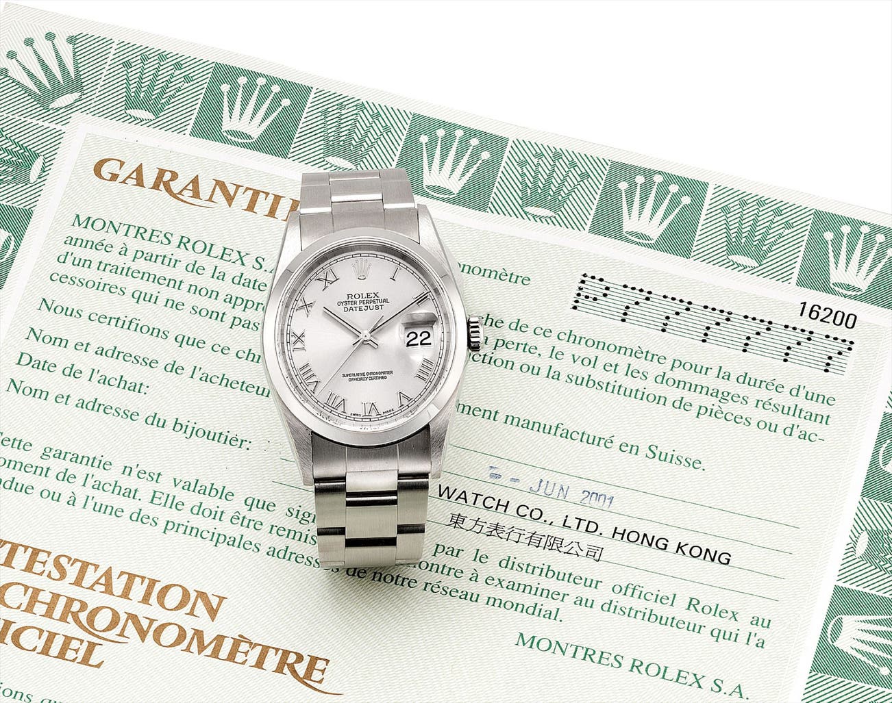 勞力士,不銹鋼自動上弦鏈帶腕錶,配中心秒針及日曆顯示,“DateJust”,型號16200,附證書,約2001年製
