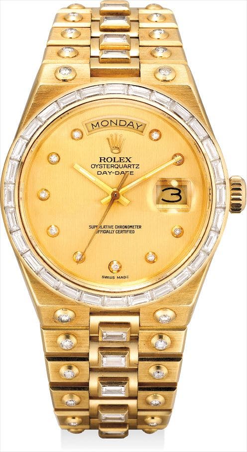 勞力士,非常罕有,18K黃金鑲鑽石,石英鏈帶腕錶,配中心秒針、鑽石鏈帶、星期及日曆顯示,“Day-Date Oyster Quartz”,型號19168,約1986年製