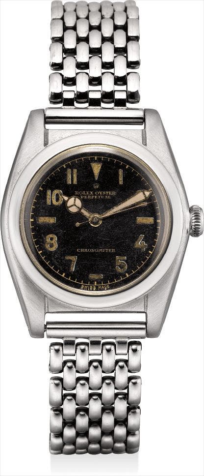 勞力士,罕有,不銹鋼自動上弦鏈帶腕錶,配中心秒針及黑色漆錶盤,“Bubble Back”,型號2764,約1944年製