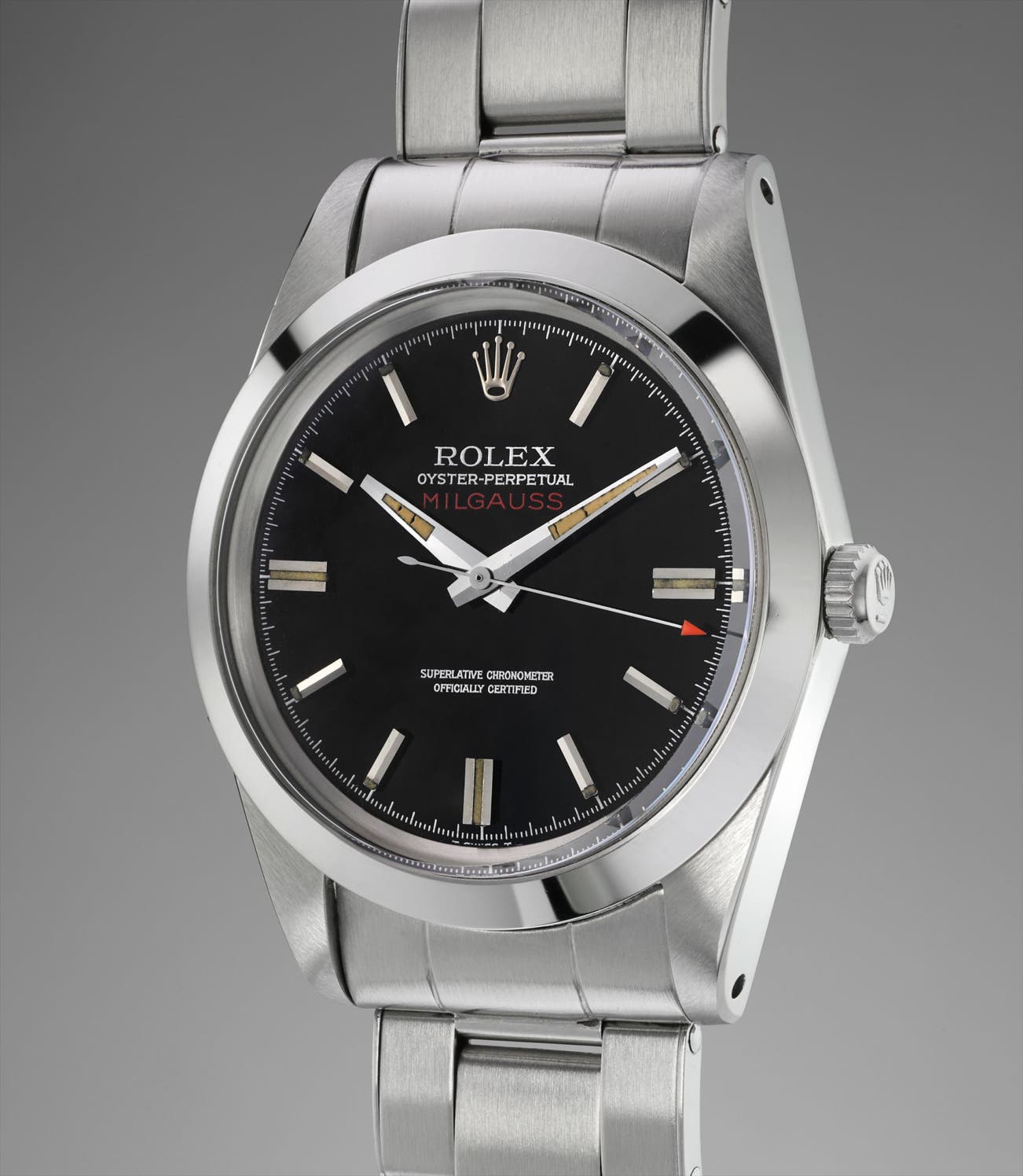 The present lot with its ultimate rarity, strong case and bracelet with crisp black glossy dial and contrasting “Milgauss” lettering is a timepiece for the connaisseur and a worthy addition to any Rolex collection.