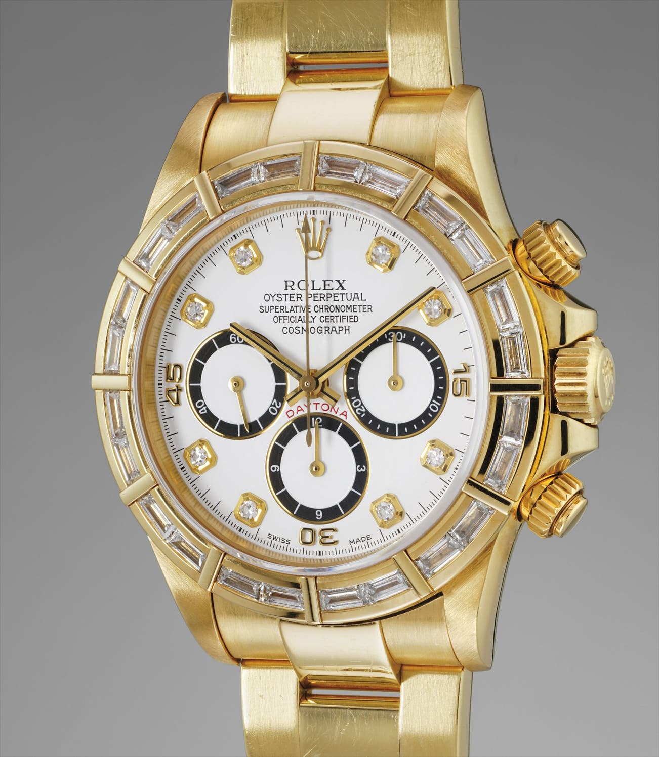 The present example is fitted with a beautiful baguette diamond-set bezel. Another detail to please the Daytona collector is the highly rare Mk3 white dial with diamond-set markers, displaying an "inverted 6" in the sub register at 6 o'clock, along with the reappearance of the "officially certified" text at 12 o'clock.