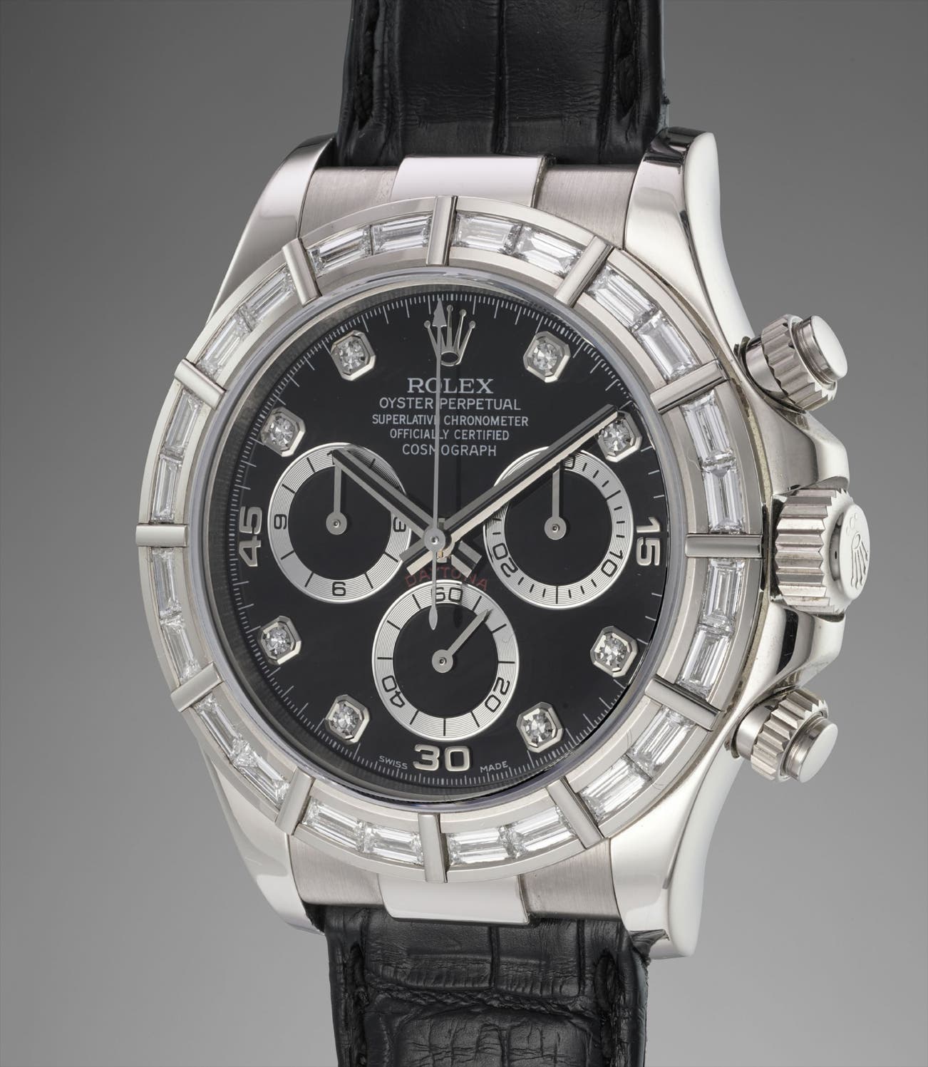 The white gold case fitted with a baguette diamond-set bezel and diamond-set numerals combines Rolex's gift in gem-setting and creating beautiful movements. The black glossy dial with red “Daytona” printing adds a dash of subtle panache to an already spectacular watch whose design is seductive, nonchalant and euphoric.