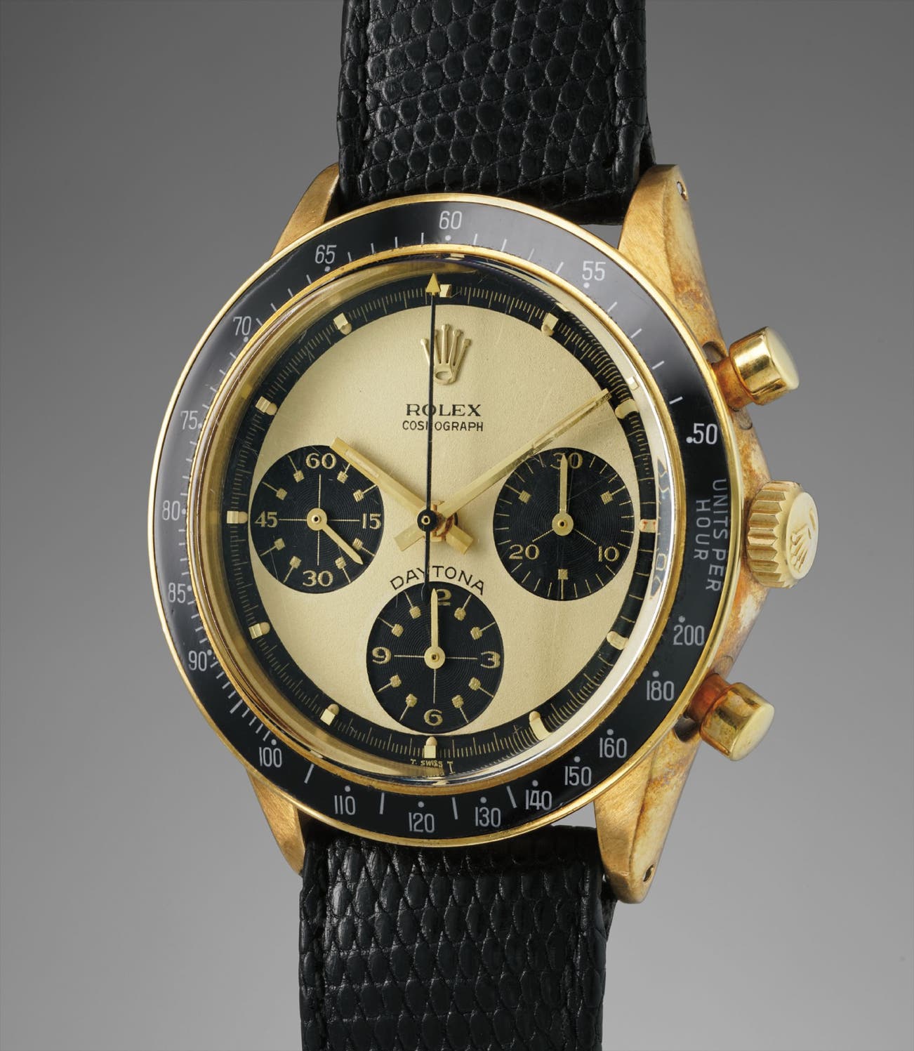 This reference differed from other Daytona models with a new case design that introduced a small protrusion under the crown, which allowed easier winding of the mechanical Valjoux caliber 722. It also featured a new bezel made of a metal support fitted with a black acrylic insert with a tachymeter scale printed in white. The “T SWISS T” designation at the lower edge of the dial by 6 o’clock indicates the use of tritium for the hands and luminous hour markers. It is also from this reference on that the word ‘Daytona’ would be officially printed on the dial.
