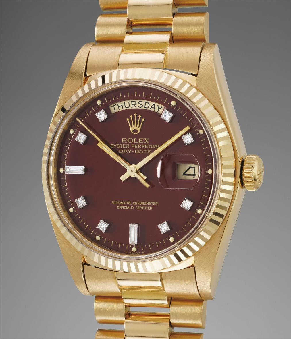 The present Day-Date, reference 1803, features a rich and incredibly glossy Burgundy "Stella" dial, which contrasts vibrantly against the diamond-set numerals. Despite being over 35 years of age, the dial still retains its highly glossy finish, just as if it left the factory yesterday. It is preserved in excellent condition, with no cracks or hairlines at all. All luminous dots are intact and perfectly match the luminous on the hands.