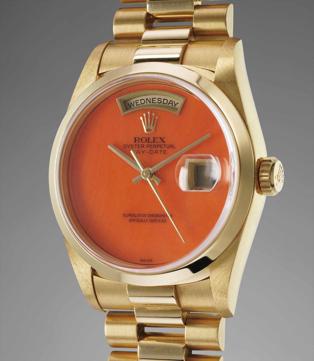 A highly rare and very attractive yellow gold calendar wristwatch with centre seconds, coral dial and bracelet