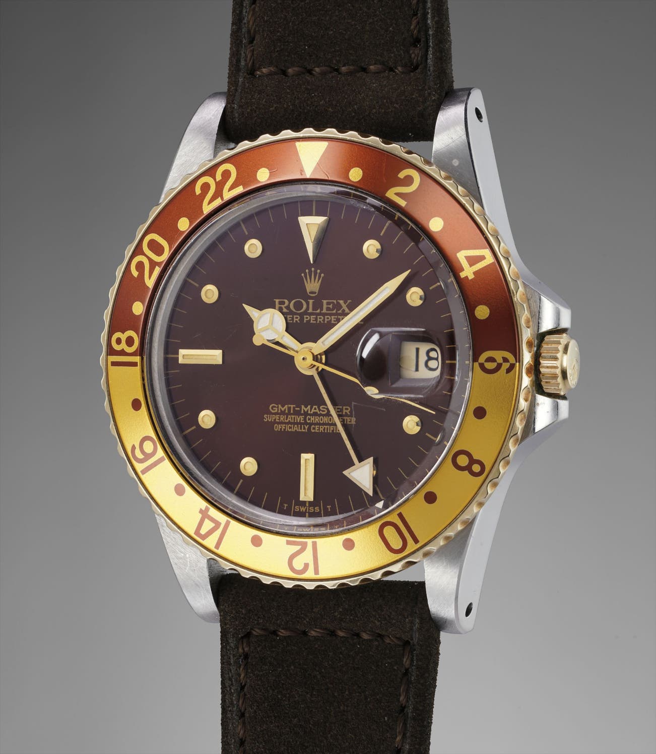 This watch, reference 16753, is a rare variant within the GMT family as it is cased in both stainless steel and yellow gold. It has a beautiful brown dial and caramel and chocolate bezel. Collectors dub this model the 'Root Beer'. The present watch features no 'flaking' to the 'nipple' dial, which is extremely rare, as this particular dial is known easily crack over time. The bezel remains vibrant, displaying a sharp gold and light brown colour, giving the watch a very charismatic look.