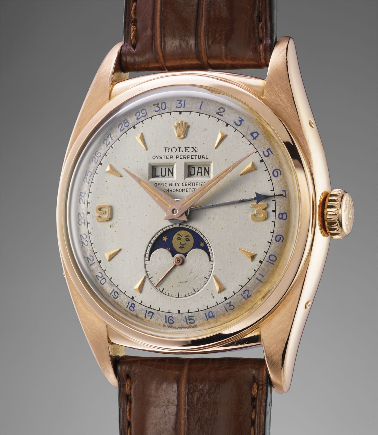Reference 6062 is one of only two Rolex models ever to feature a full calendar paired with the indication of the phases of the moon, together with reference 8171. This marvel of finesse and sophistication is a condensate of Rolex's genetic code: the iconic Oyster case, a Rolex "perpetual" in-house movement and of course the ultimate rarity of a full calendar complication featuring a moonphase display. The reference 6062 embodies what Rolex stands for without a shred of compromise.