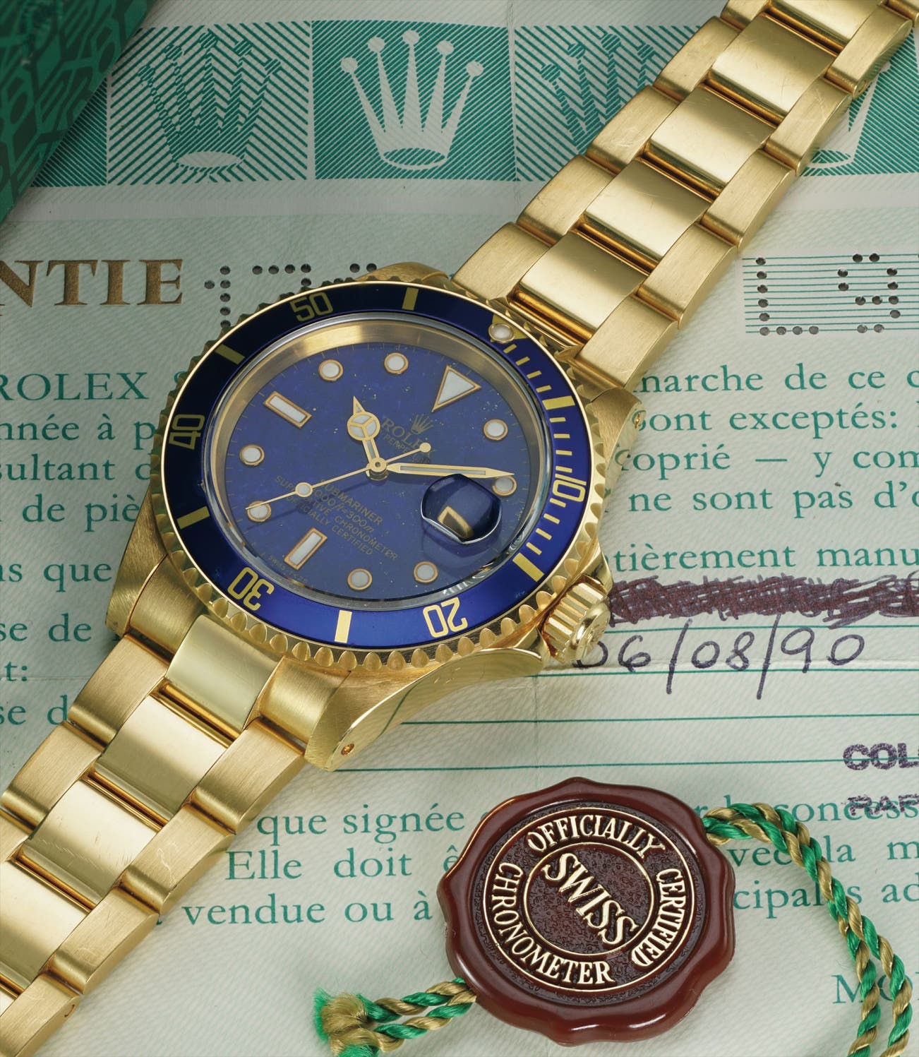 A highly rare and very attractive yellow gold wristwatch with centre seconds, date, lapis lazuli dial and bracelet with punched guarantee and box