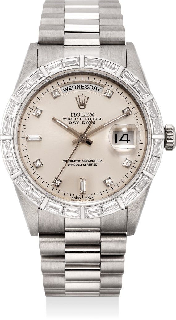 勞力士,「Day-Date」型號18369 ,18K白金鑲鑽自動上弦鏈帶腕錶,配日期和星期顯示,約1990年製
