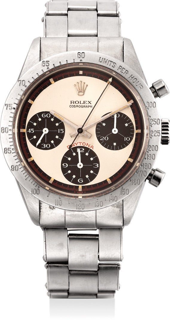 勞力士,「Cosmograph Daytona」型號6241 ,精細及非常罕有,精鋼鏈帶腕錶,配計時功能及「Paul Newman」錶盤,約1967年製。附錶盒和保證書