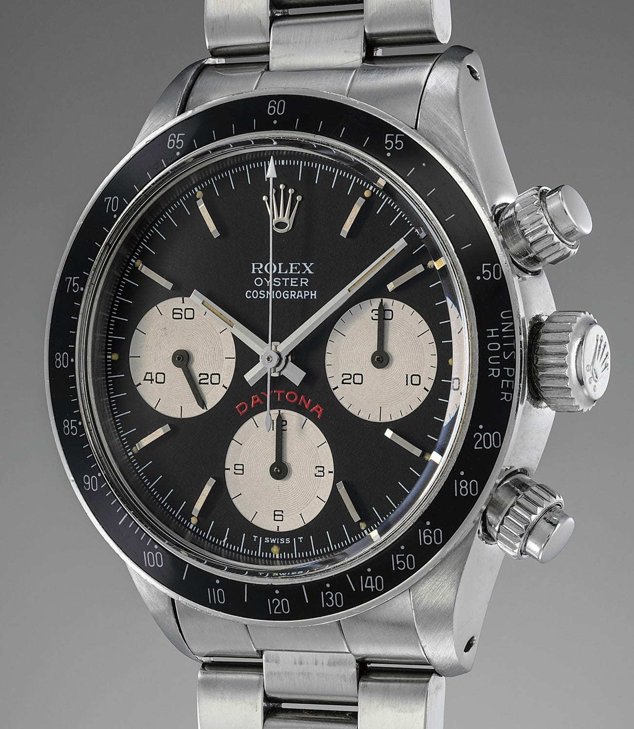 The present Daytona remains in overall very attractive condition, its case maintains sharp edges and thick lugs, the matte black dial is counterbalanced by white subdials, the "Big Red" Daytona signature adding a dash of color.