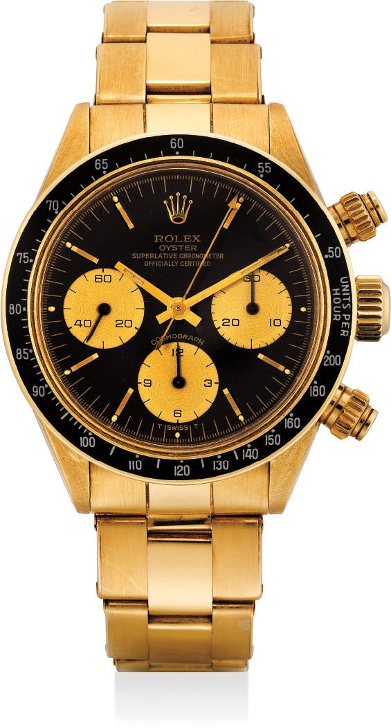 One of its most famous models is the Cosmograph Daytona. Launched in 1963, these chronographs are without any doubt amongst the most iconic and coveted of all collectible wristwatches. Other key collectible models include their most complicated vintage watches, including references 8171 and 6062 with triple calendar and moon phase, "Jean Claude Killy" triple date chronograph models and the Submariner, including early "big-crown" models and military-issued variants.
