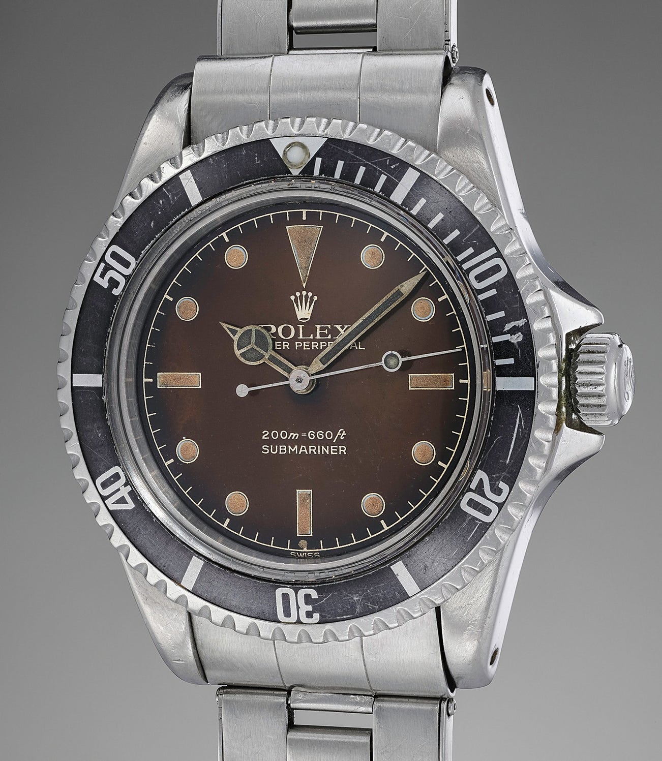 Undoubtedly, the dial is the attention catalyst. Its most obvious feature is the sublime tropicalization, offering a milk chocolate center surrounded by a darker halo for an irresistible final aesthetic effect. However, this dial reserves another surprise: the small radium dot at 6 o’clock unmistakably identifies this as an “exclamation mark” dial - the name coming from the ensemble dot and index, which resembles an exclamation mark. Such dials were in production only during a short period of time between 1961 and 1962 and are one of the first attempts to identify a lower radiation count compared to earlier dials. In fact, the harmful effect of radiation was at that time in the process of being identified and regulated. Exclamation mark dials still feature radium - tritium will come immediately after - but in much lower amount than earlier specimens.