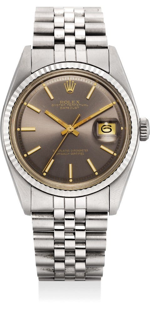 勞力士,「Datejust」型號1601,精鋼自動上弦鏈帶腕錶,配日期顯示和「Sigma」錶盤,約1977年製。附錶盒、保證書、天文台證書
