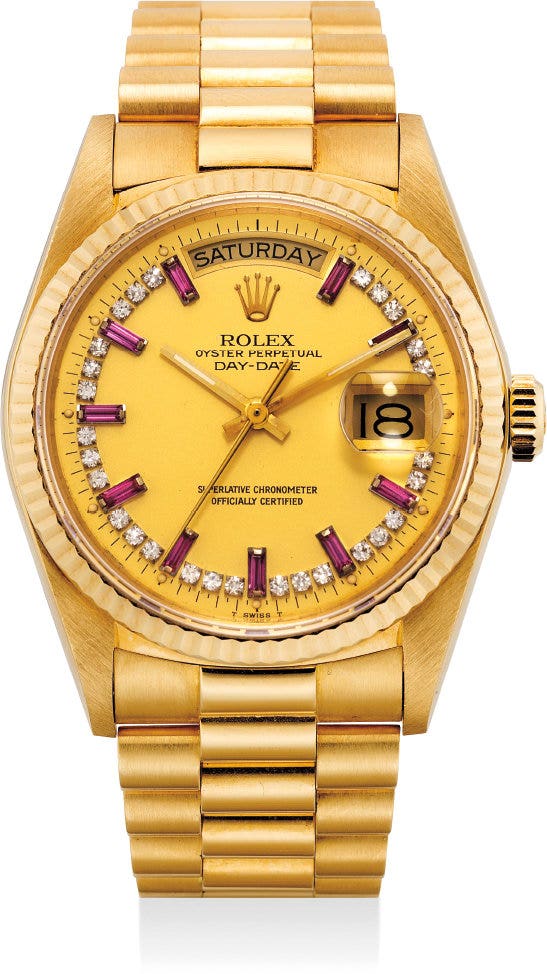 勞力士,「Day-Date」型號18038,18K黃金自動上弦鏈帶腕錶,配有日期、星期顯示、和鑲鑽石及紅寶石錶盤,約1985年製。附保證書