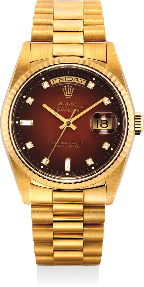 勞力士,「Day-Date」型號18238,18K黃金自動上弦鏈帶腕錶,配日期、星期顯示和鑲鑽漸變色錶盤,約1988年製。附錶盒和保證書
