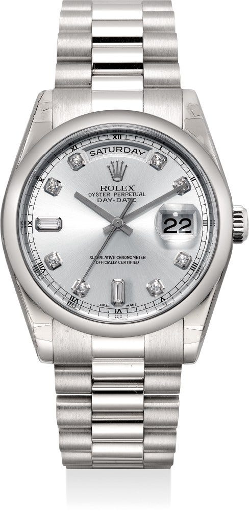 勞力士,「Day-Date」型號118206,非常精細及罕有,鉑金自動上弦鏈帶腕錶,配日期顯示和鑽石時標錶盤,約2001年製。附錶盒和保證書
