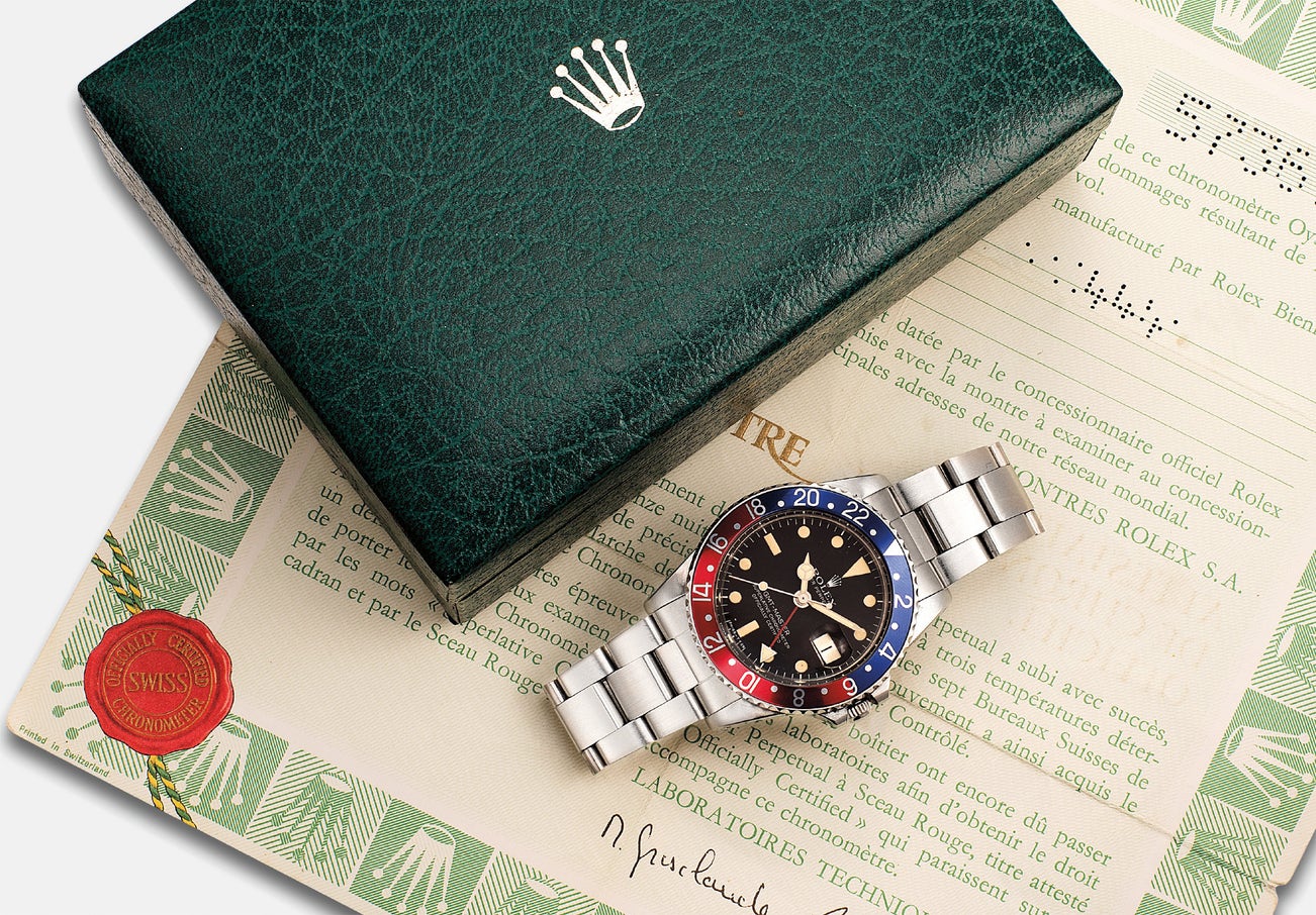 勞力士,「GMT-Master」型號1675,精細及罕有,精鋼自動上弦鏈帶腕錶,配兩地時區和日期顯示,約1979年製。附錶盒和保證書