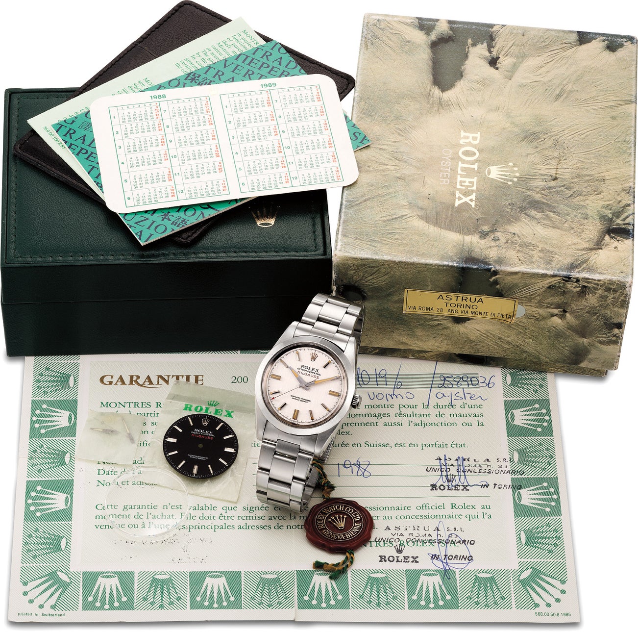Completing the extraordinary set of accessories of this timepiece, it is provided not only with its 1988 Rolex Garantie double stamped by Astrua, but also with its original 1970s box and outer packaging, duly bearing both the Astrua label and the tiny silver dot identifying this piece as a silver dial one. Compounding to this the extremely well preserved condition of both case and dial - the owner used it only a handful of times - it is safe to say that the present Milgauss 1019 is one of the most attractive and collectible to recently appear on the public market.