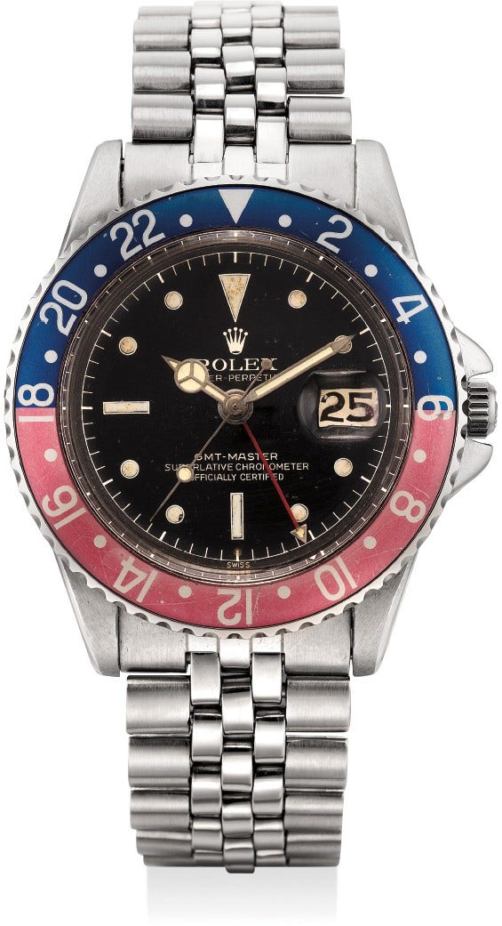 勞力士,「GMT-Master」型號1675 ,精鋼自動上弦鏈帶腕錶,配兩地時間、日期顯示和黑色亮面錶盤,約1961年製