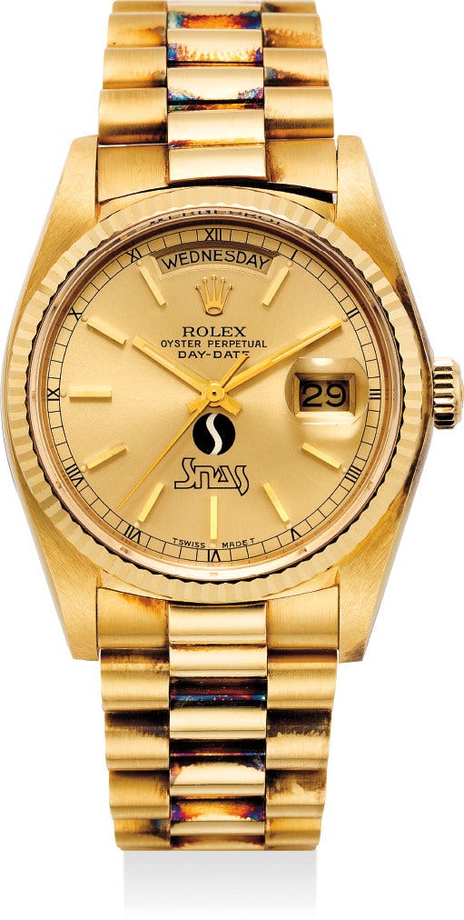 勞力士,「Day-Date」型號18038,精細及非常罕有, 18K黃金自動上弦腕錶,配日期和星期顯示,特別為SNAS製作,約1983年製。附保證書