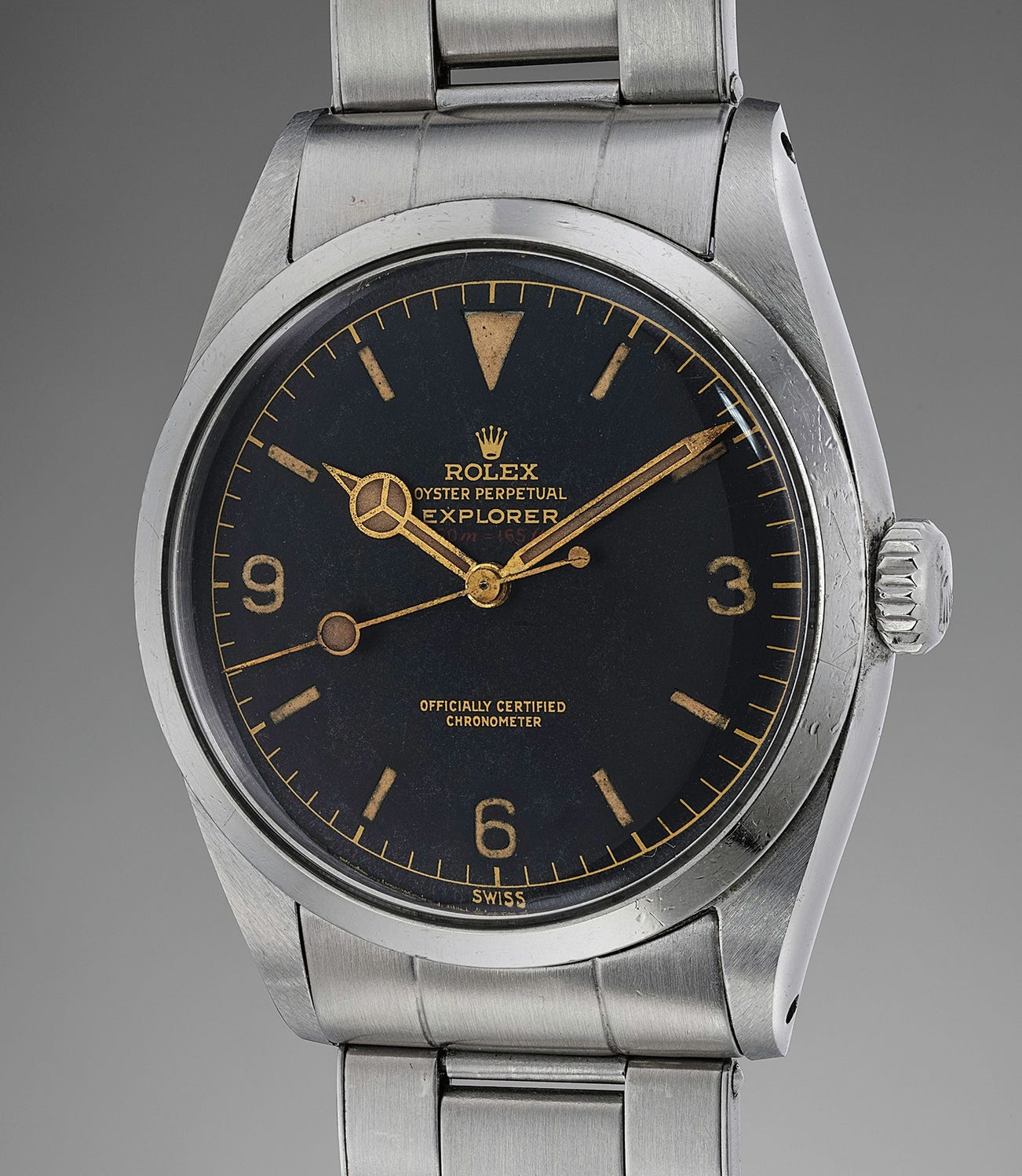 The present timepiece features the classic black, gilt dial and “3-6-9” hour numerals that characterize Rolex’s Explorer models.