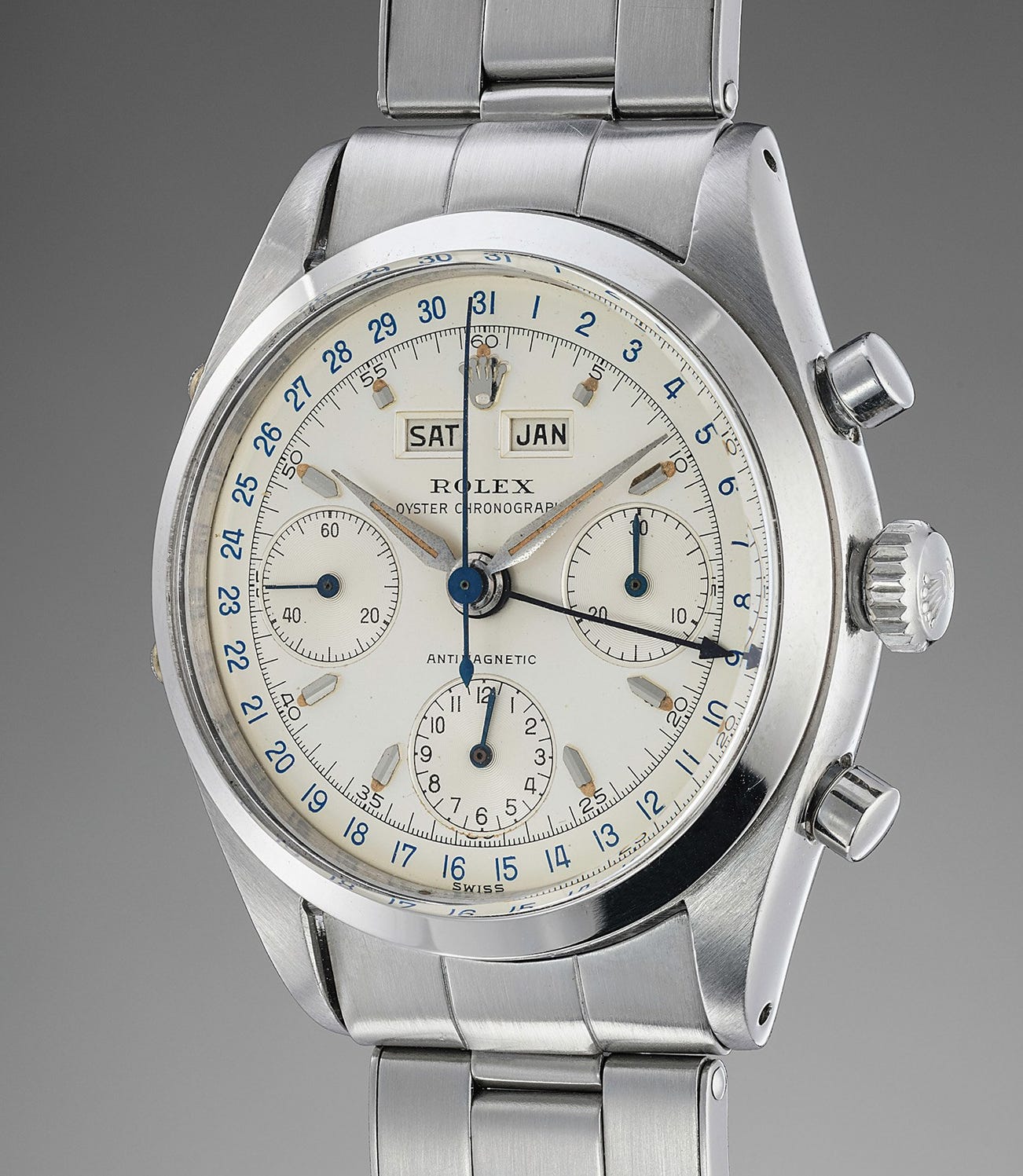 The present example is an outstanding unmolested specimen. The case is unpolished with strong powerful lugs and harmonious proportions. The silver dial is superb condition and displays a crisp blue date ring with the correct closed-loops for the 6 and 9 numerals, typical for this reference and baton hands, which later set the benchmark for future Rolex chronographs.