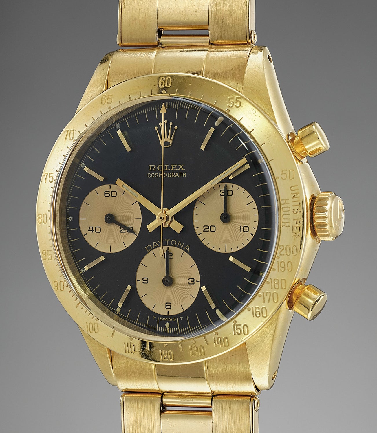 It is estimated that only about 450 examples were made in gold (either 18K or 14K), making the present example a highly collectible specimen of the first gold Daytona model made. Such a restricted production can be explained by considering the tool watch vocation of the model, which was conceived as a sport's watch and thus was preeminently demanded with the sturdy and lightweight stainless steel case.
