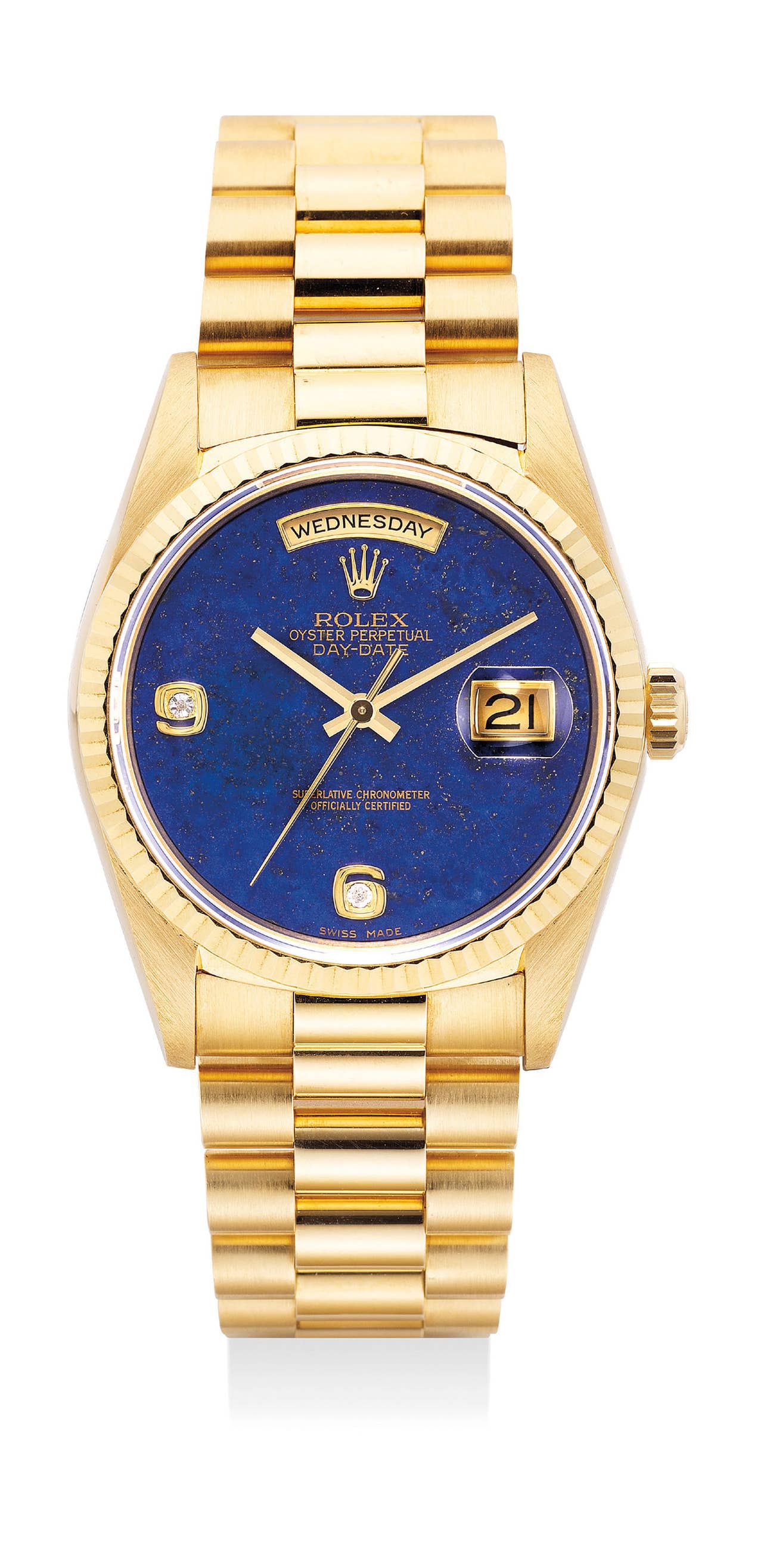 勞力士,「Day-Date」型號18238,精細及非常罕有,18K黃金自動上弦鏈帶腕錶,配日期、星期顯示及青金石錶盤,1990年製。附錶盒和保證書