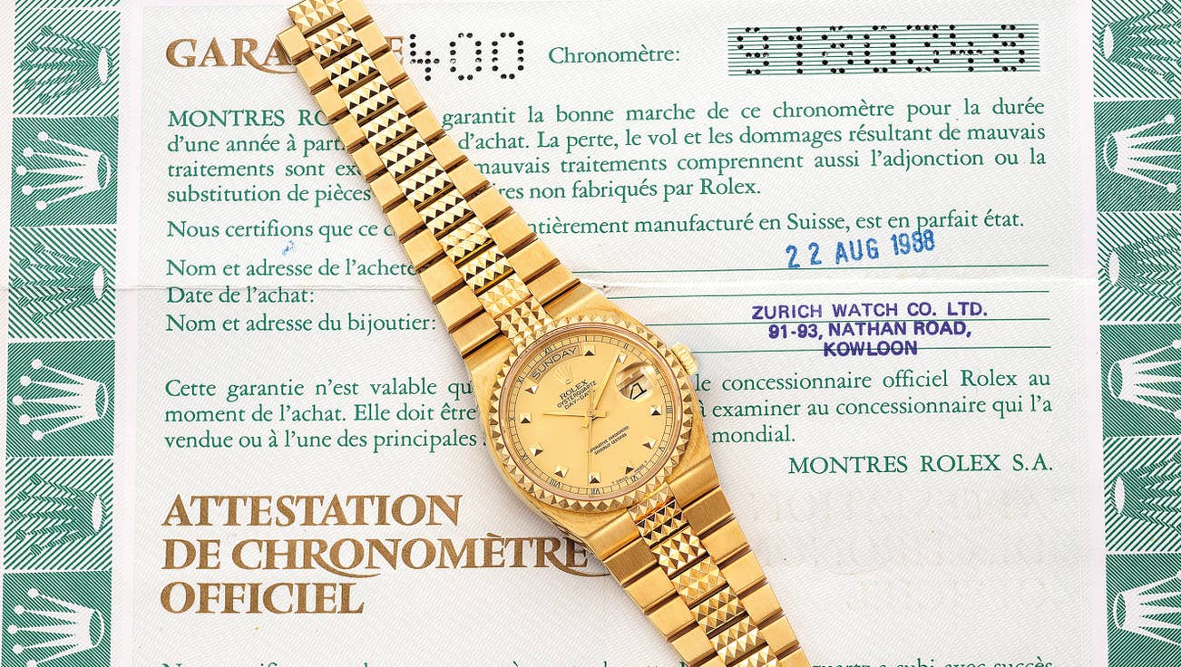 For a number of reasons, this particular OysterQuartz is a particularly outstanding watch. First of all, the present example features a “Pyramide” bezel and bracelet which are very rare and highly sought after. Secondly, the watch is preserved in impeccable condition. Likely unpolished, the case is sharp and well-defined. The luminous materials on the hour markers and hands are also immaculately intact. Last but not least, the watch is accompanied by the original punched Rolex guarantee dated August 22, 1988, adding another element of collectability.