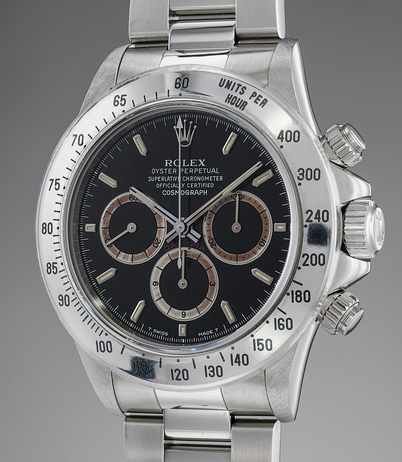 Today, a serious Rolex collection can not be considered complete without an example of the “Zenith” Daytona (so called because the automatic calibre was supplied by Zenith and then modified and finished by Rolex), and the model is constantly increasing in popularity. Over time, scholarship on the reference has expanded, and some iterations - such as the “Floating” ones, or the porcelain dials, or the “Four Liners” - have come to be recognized as supremely collectible timepieces. The most visually striking among these “next level” Zenith Daytonas is arguably the “tropical” variation, perfectly exemplified by the present timepiece. The result of defective batches of paint delivered to Rolex in the mid-1990s, these timepieces sport white chapter rings which over time turned brown. The process - and its result - is influenced by a multitude of factors, such as the batch of paint, the exposure of the dial to light, and so on. Thus, the final result is unique for each piece, with sometimes, such as in this instance, striking surprises. The chapter ring of this specimen in fact tropicalized unevenly and today they feature an incredible “tie-dye” effect to the tropicalization.