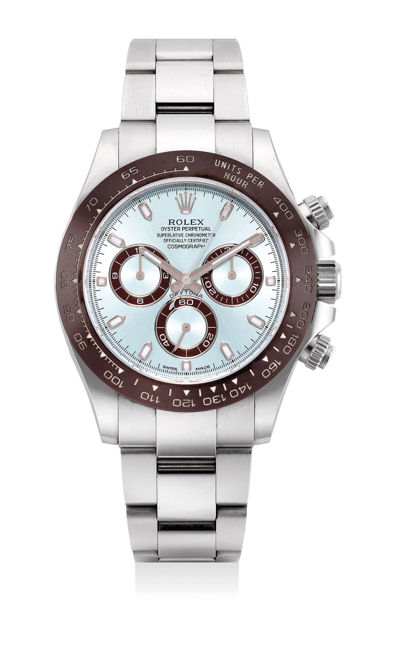 勞力士,「Cosmograph Daytona」型號116506 ,非常精細及罕有,鉑金自動上弦鏈帶腕錶,配計時功能和冰藍色錶盤,約2018年製。附證書﹑錶盒和配件