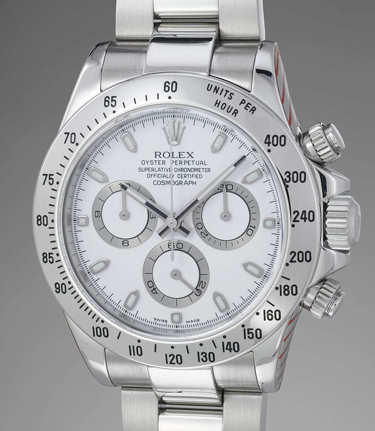 The present watch is an incredibly rare and novel example of reference 116520, as the dial does not display the usually-found red 'Daytona' script at 6 o'clock. Most importantly, this watch is accompanied by correspondence between the owner and Rolex, confirming the originality of the dial. The watch most likely left the Rolex factory as is, due to a quality control oversight. Today, this 'mistake' has rendered the present watch incredibly rare and valuable, giving it a unique appearance. To the best of our knowledge, the present watch is the only known reference 116520 with this dial configuration to have appeared on the auction market.