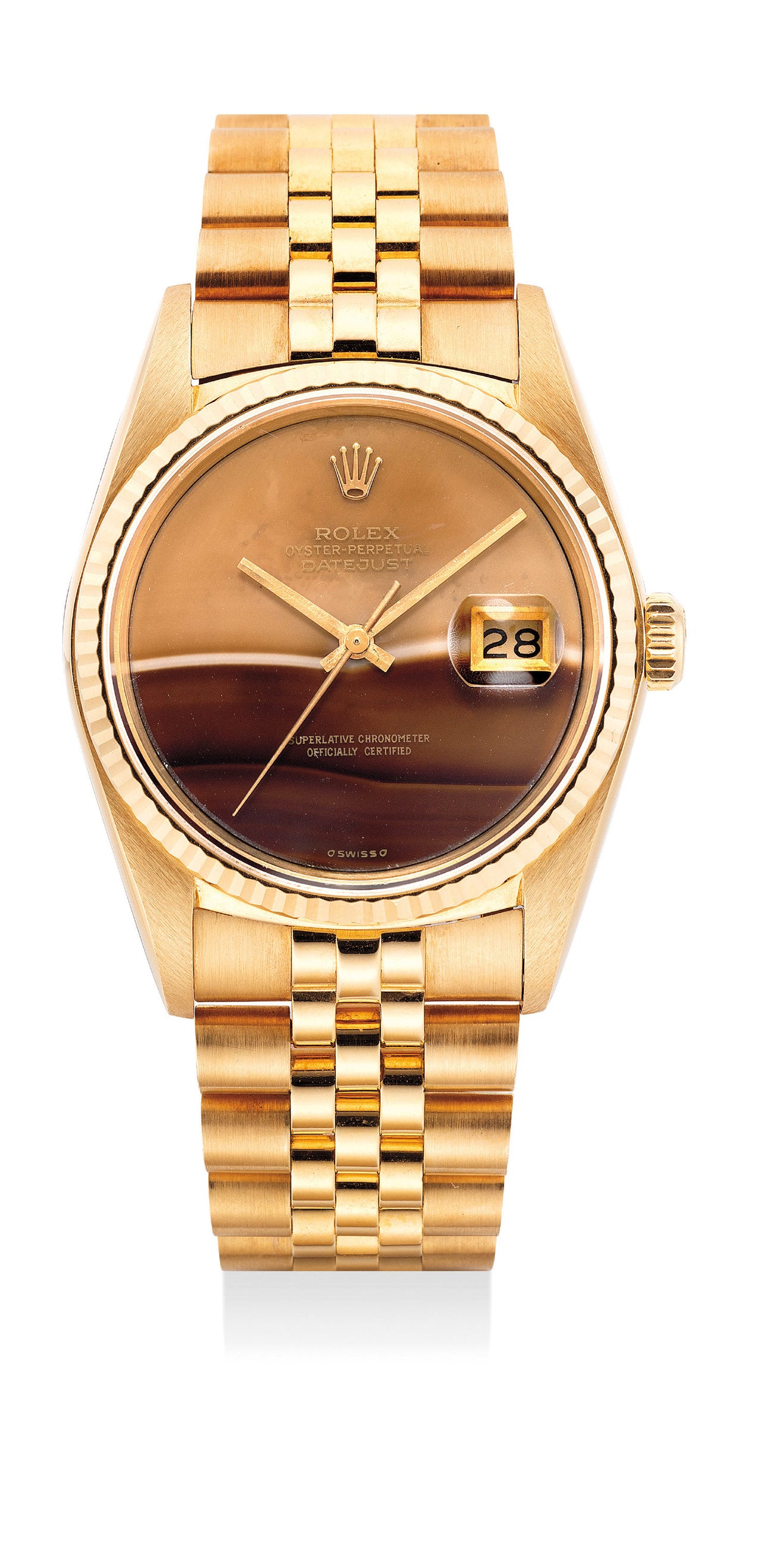 勞力士,「Datejust」型號16018,十分精細,18K黃金自動上弦鏈帶腕錶,配特殊礦石錶盤和日期顯示,約1985年製