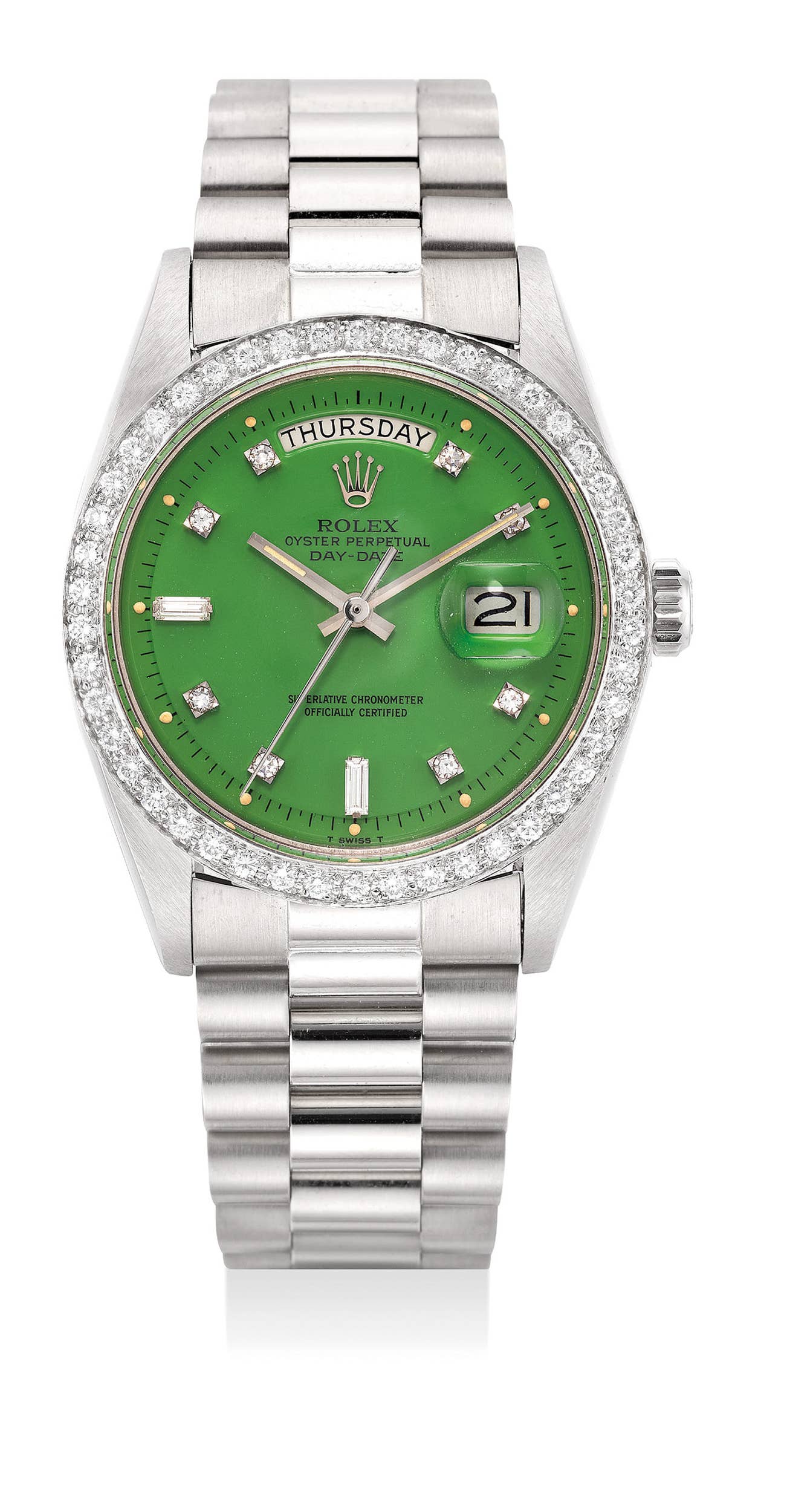 勞力士,「Day-Date」型號1804,非常精細及罕有,18K白金鑲鑽自動上弦鏈帶腕錶,配「Stella」綠色亮漆面盤和日期顯示,約1978年製。附保修卡