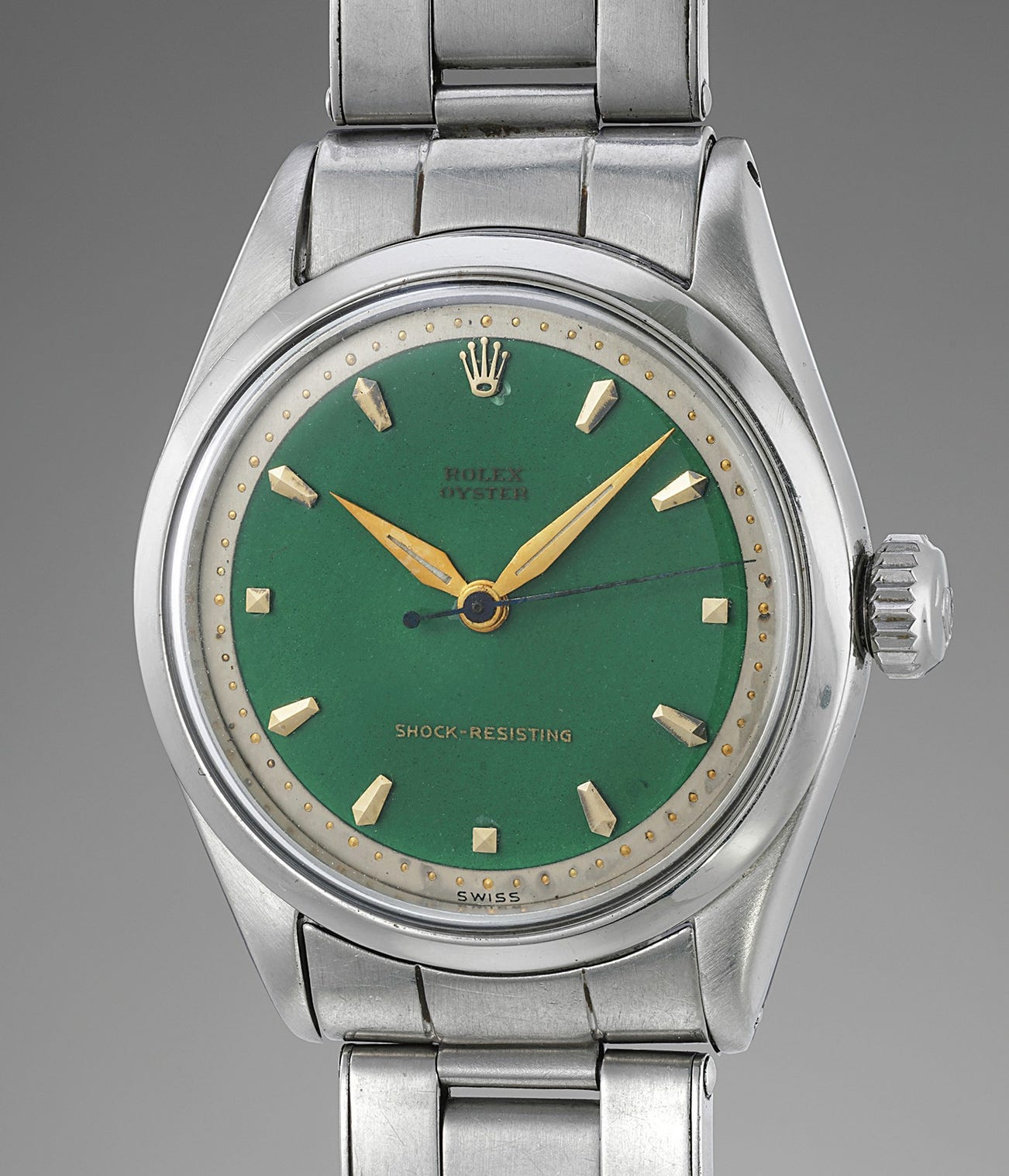 An attractive stainless steel wristwatch with green enamel dial and bracelet