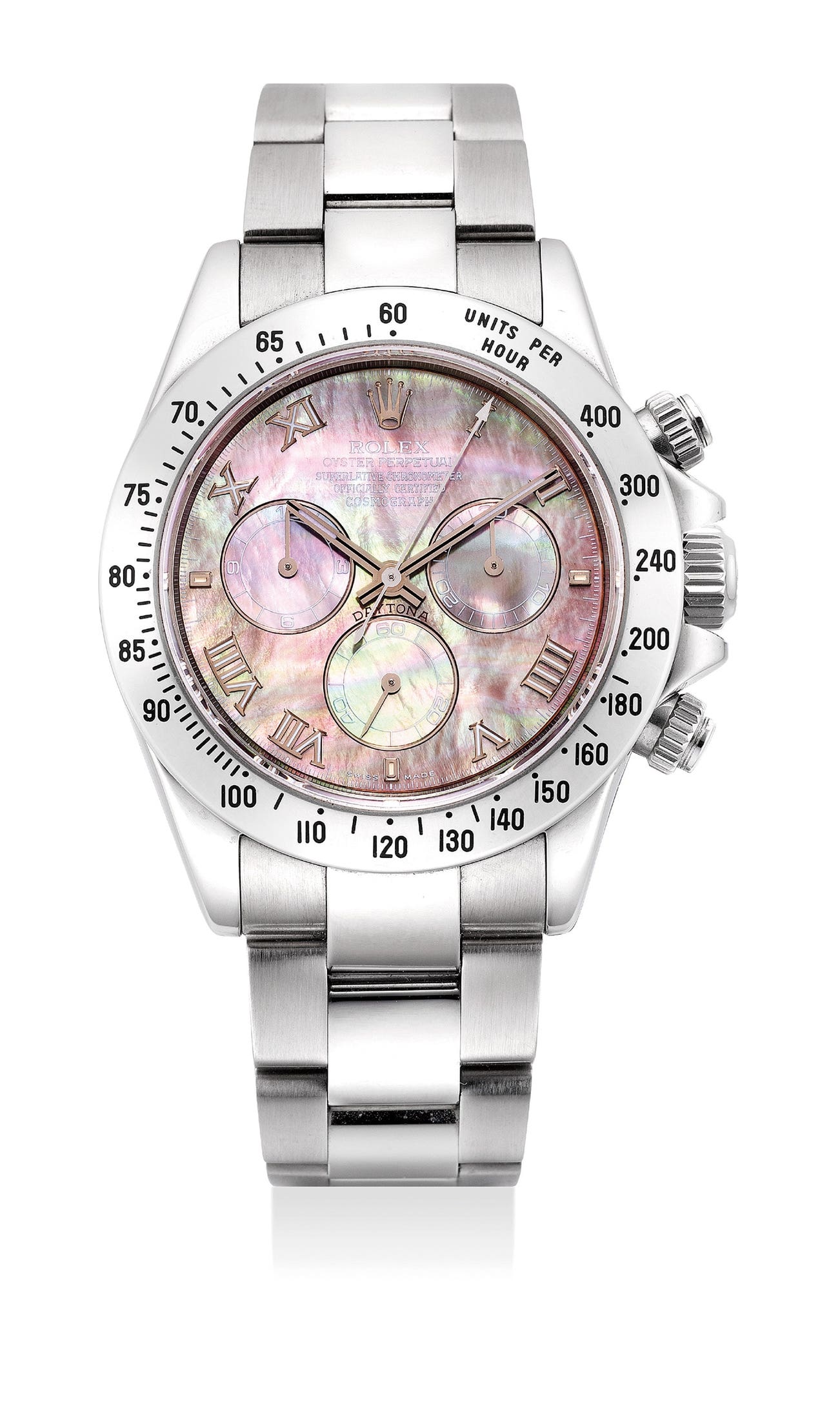 勞力士,「Cosmograph Daytona」型號116520,非常精細,精鋼自動上弦鏈帶腕錶,配珠母貝面盤和羅馬數字時標,約2002年製。附錶盒、保證書、備用錶盤、配件