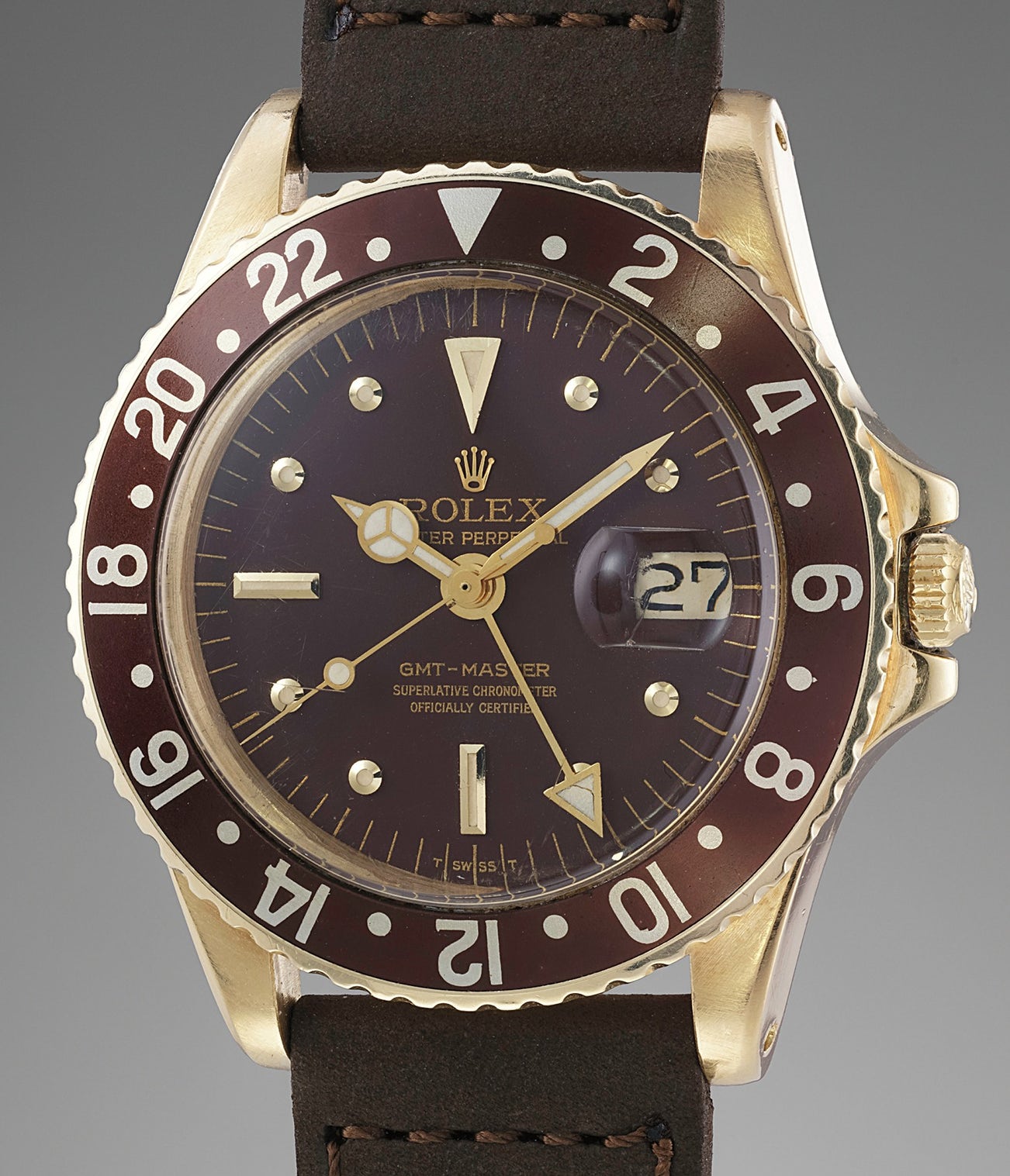 The rich tones of the gold and brown bezel and dial, boosted by decades of aging, provide the wearer a glimpse into the golden era of travel. A handsome example, this GMT-Master ticks all the boxes for both the casual and serious collector with its distinguished gold case, beautiful dial, and excellent condition. It will bring years of pleasure to its next owner.