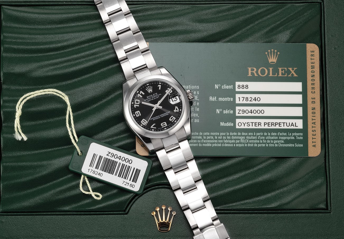 勞力士,「Datejust」型號178240,罕有,精鋼自動上弦鏈帶腕錶,配黑色機鏤雕飾錶盤、中心秒針和日期顯示,约2008年製。附保證書﹑錶盒和配件