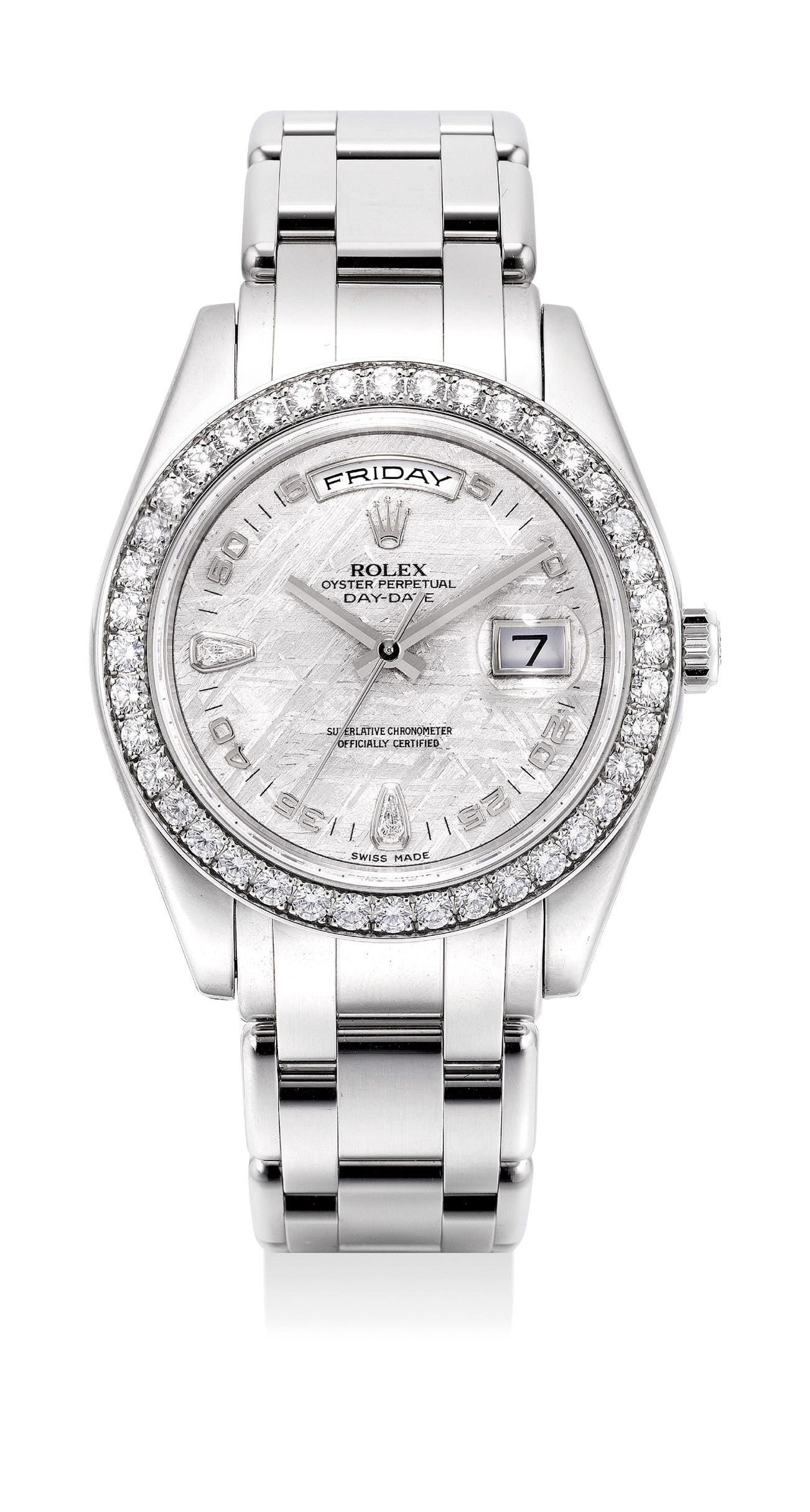 勞力士,「Day-Date, Masterpiece」型號18946,十分精細及非常罕有,鉑金鑲鑽自動上弦鏈帶腕錶,配日曆、星期顯示和隕石面盤,約2001年。附錶盒和保證書