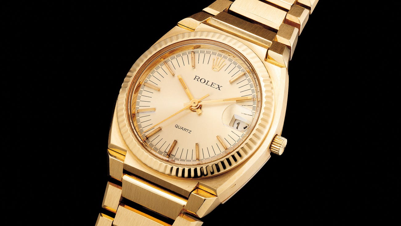 勞力士,「Beta 21 Texano」型號5100,精細,18K黃金石英鏈帶腕錶,配中心秒針和日期顯示,約1970年製。附錶盒、備用錶盤和鏡面