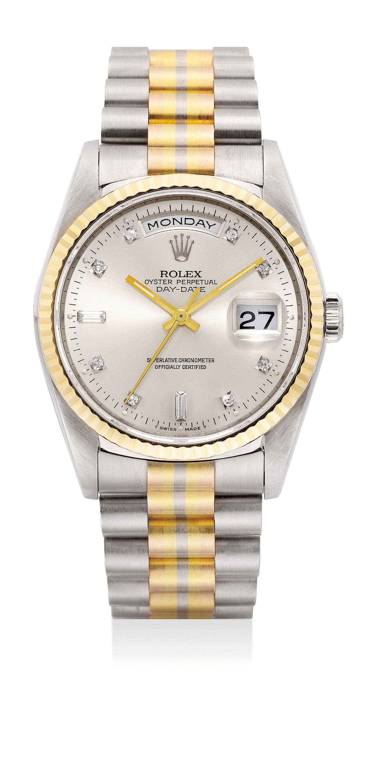 勞力士,「Day-Date, Tridor」型號18239B,精細及罕有,18K三金自動上弦鏈帶腕錶,配日曆、星期、鑽石時標和中心秒針,約1990年製。附備用鏈節和配件