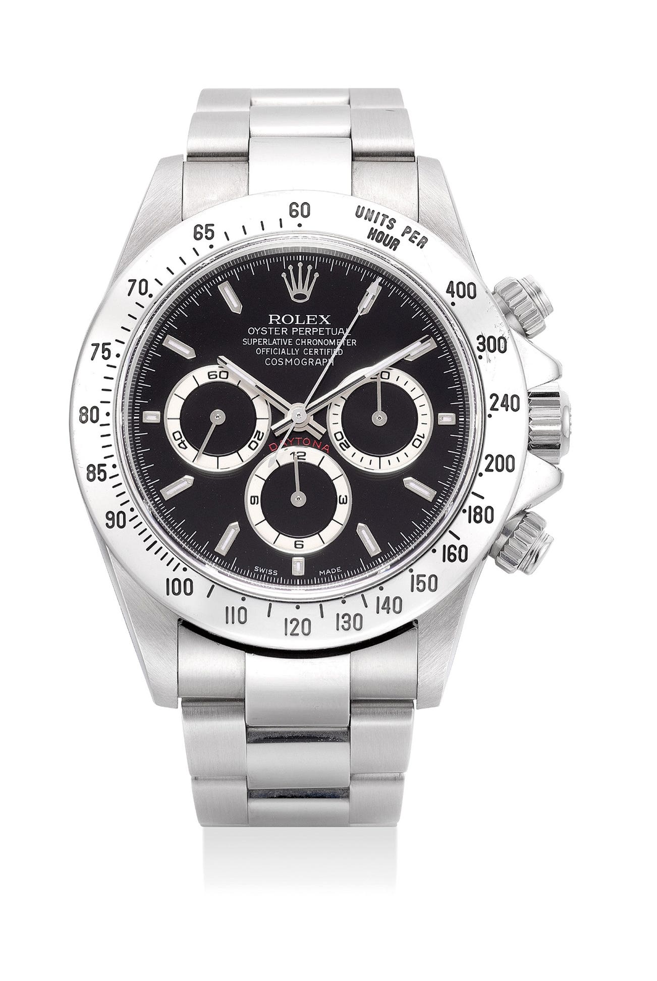 勞力士,「Cosmograph Daytona」型號16520,精鋼自動上弦鏈帶腕錶,配計時功能和中心秒針,約1999年製。附原裝錶盒、保證卡、配件
