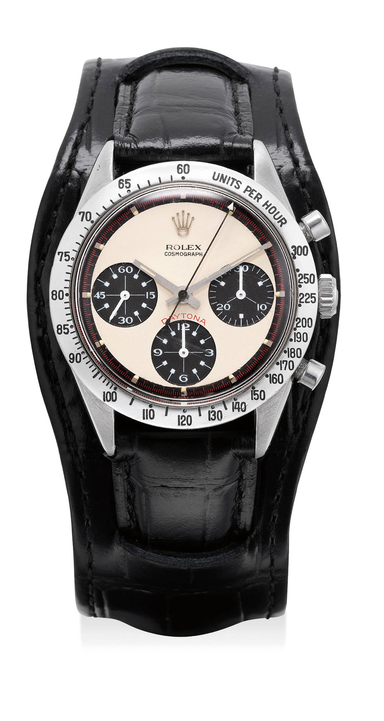 勞力士,「Cosmograph Daytona Paul Newman」型號6239,精鋼鏈帶腕錶,配計時 功能和「Paul Newman」錶盤,1967年製。附錶盒