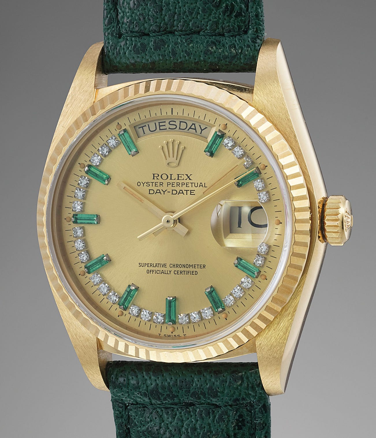 The present watch is one among an exceedingly limited number of Day-Dates featuring emerald baguette numerals. Bright and translucent, the diamonds and emeralds pop against the champagne dial, giving the watch a singular appearance. Such examples come to the market very rarely, and when they do, it is a notable occasion.