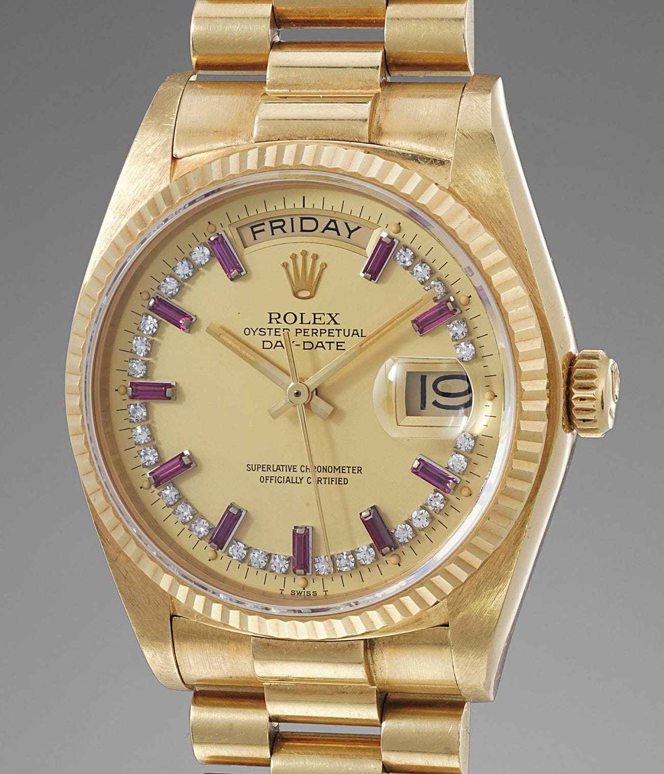 Produced between 1977 and 1988, reference 18038 is characterized by its yellow gold case, bracelet and fluted bezel. The model most notably features a sapphire crystal. It is furthermore distinguished by the diamond and ruby-set champagne dial, giving it an incredibly glamorous edge. Furthermore, the case is preserved in excellent condition with crisp edges and sharp finishes. It most likely has never seen polishing throughout its lifespan.