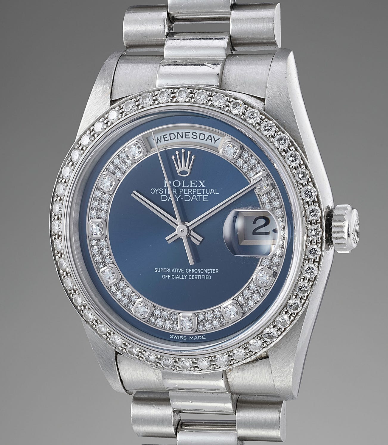 Heavy, lavish and luxurious, platinum is known as the noblest of all metals. Displaying a blue dial featuring brilliant diamonds set with chatons and a pavé technique, this timepiece is completely dazzling. Platinum is the rarest case metal for serially produced Day-Date models, and this particular watch, preserved in excellent and most probably unpolished condition, is nothing short of spectacular. It is furthermore accompanied by a Rolex International Service Guarantee dated March 7, 2017.