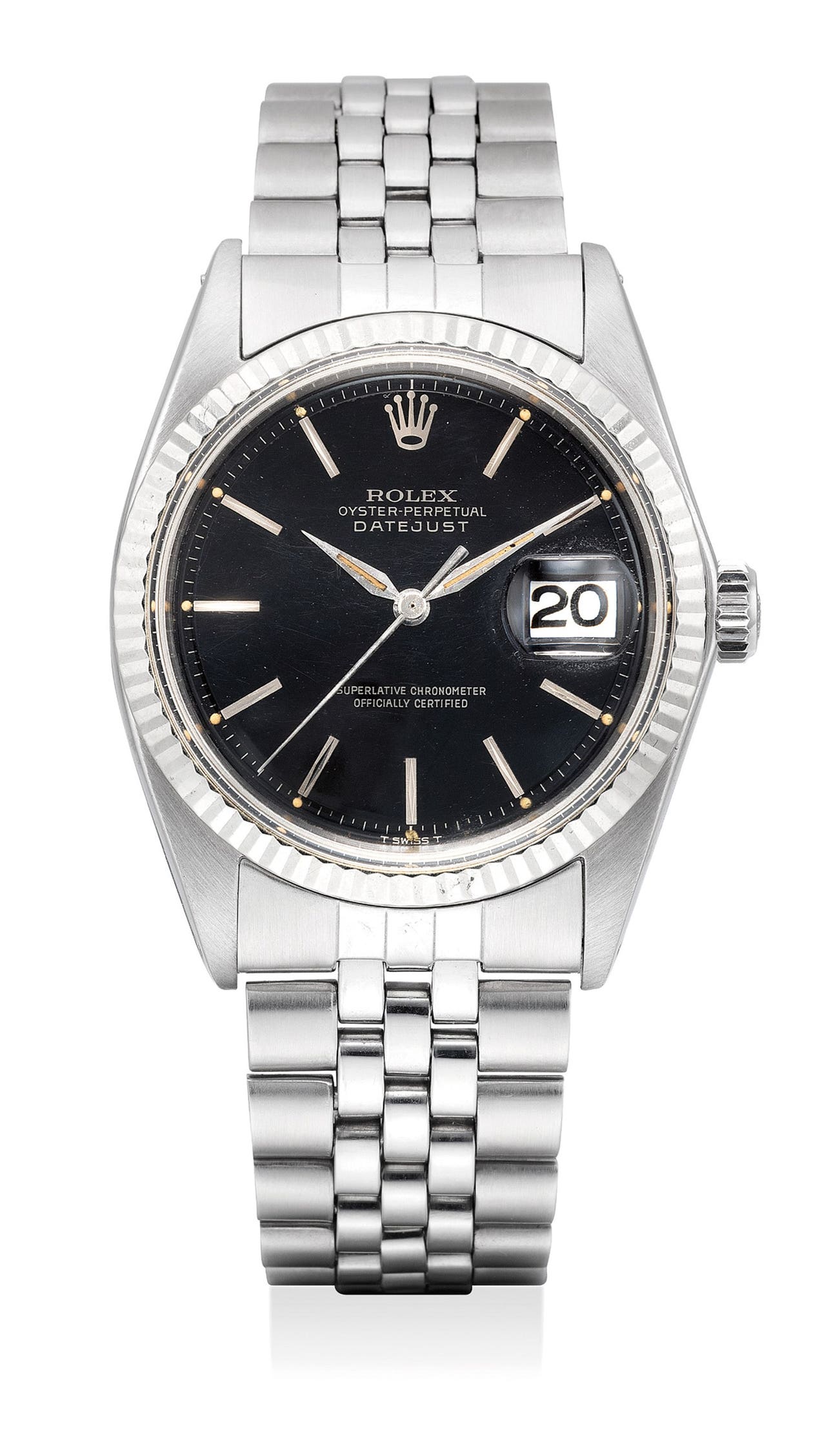 勞力士,「Datejust」型號1601,精細,精鋼自動上弦鏈帶腕錶,配日期和黑色亮面錶盤,約1970年製。附錶盒