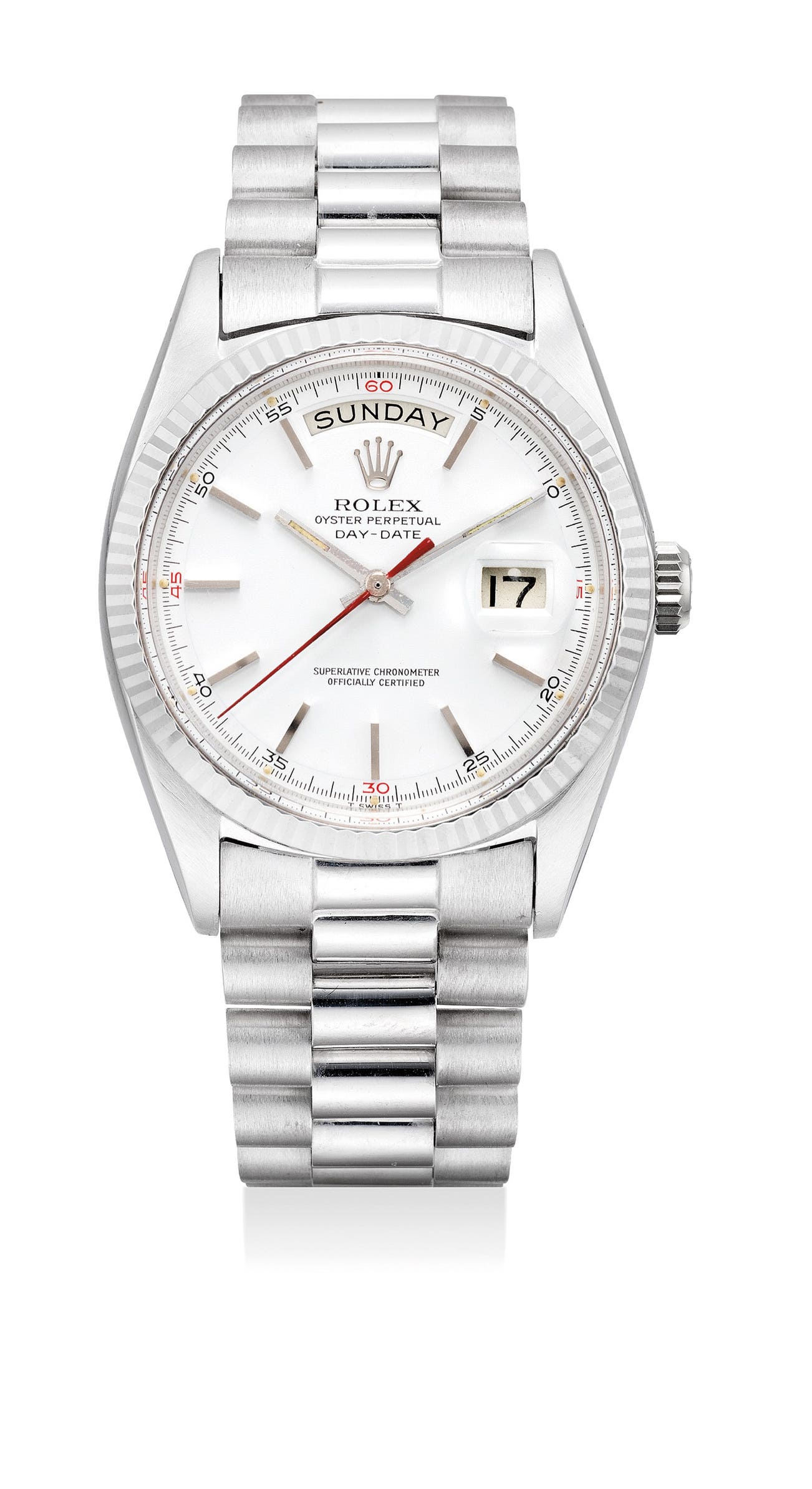 勞力士,「Day-Date」型號1803,十分精細,18K白金自動上弦鏈帶腕錶,配日期和星期,1970年製。附錶盒